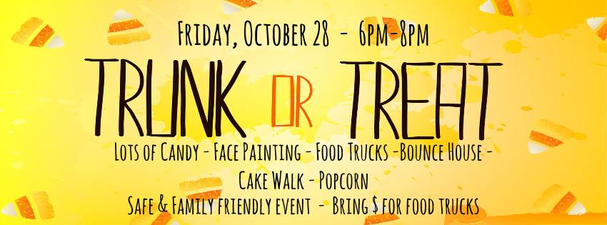 Fun, safe, free, family friendly night out! Tons of candy, face painting, bounce house, cake walk, popcorn and more– all free! Food Trucks will also be available to purchase food from. All are invited!